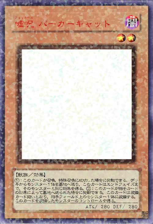 「フェイカーズ3枚目です。名前の意味は猫を被る(キャット、パーカー)です。攻撃力はにゃんにゃん(280280)で、効果をパクり、相手もパクる効果。どちらも強い。」(2018-03-19 00:23)