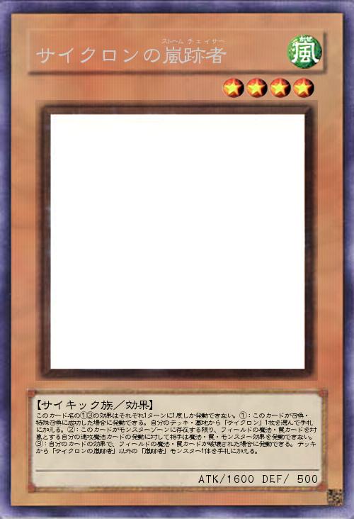| このカード名の①③の効果はそれぞれ1ターンに1度しか発動できない。①:このカードが召喚・特殊召喚に成功した場合に発動できる。自分のデッキ・墓地から「サイクロン」1枚を選んで手札に加える。②:このカードがモンスターゾーンに存在する限り、フィールドの魔法・罠カードを対象とする自分の速攻魔法カードの発動に対して相手は魔法・罠・モンスター効果を発動できない。③:自分のカードの効果で、フィールドの魔法・罠カードが破壊された場合に発動できる。デッキから「サイクロンの嵐跡者」以外の「嵐跡者」モンスター1体を手札に加える。 | |||