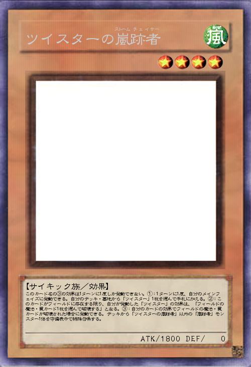 | このカード名の③の効果は1ターンに1度しか発動できない。①:1ターンに1度、自分のメインフェイズに発動できる。自分のデッキ・墓地から「ツイスター」1枚を選んで手札に加える。②:このカードがフィールドに存在する限り、自分が発動した「ツイスター」の効果は、「フィールドの魔法・罠カード1枚を選んで破壊する」となる。③:自分のカードの効果でフィールドの魔法・罠カードが破壊された場合に発動できる。デッキから「ツイスターの嵐跡者」以外の「嵐跡者」モンスター1体を守備表示で特殊召喚する。 | |||