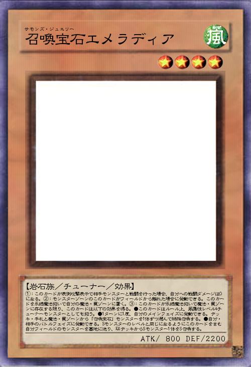| ①:このカードが表側攻撃表示で相手モンスターと戦闘を行った場合、自分への戦闘ダメージは0になる。②:モンスターゾーンのこのカードがフィールドから離れた場合に発動できる。このカードを永続魔法扱いで自分の魔法・罠ゾーンに置く。③:このカードが永続魔法扱いで魔法・罠ゾーンに存在する限り、このカードは以下の効果を得る。●このカードはルール上、風属性レベル4チューナーモンスターとしても扱う。●1ターンに1度、自分のメインフェイズに発動できる。デッキ・手札と魔法・罠ゾーンから「召喚宝石」モンスターを1体ずつ選んで特殊召喚する。●自分・相手のバトルフェイズに発動できる。Sモンスターのレベルと同じになるようにこのカードを含む自分フィールドのモンスターを墓地に送り、EXデッキからSモンスター1体をS召喚する。 | |||