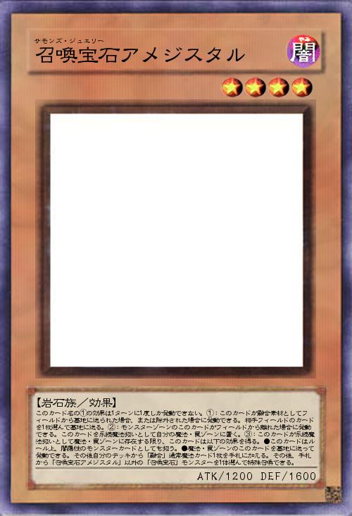 | このカード名の①の効果は1ターンに1度しか発動できない。①:このカードが融合素材としてフィールドから墓地に送られた場合、または除外された場合に発動できる。相手フィールドのカードを1枚選んで墓地に送る。②:モンスターゾーンのこのカードがフィールドから離れた場合に発動できる。このカードを永続魔法扱いとして自分の魔法・罠ゾーンに置く。③:このカードが永続魔法扱いとして魔法・罠ゾーンに存在する限り、このカードは以下の効果を得る。●このカードはルール上、闇属性のモンスターカードとしても扱う。●魔法・罠ゾーンのこのカードを墓地に送って発動できる。その後自分のデッキから「融合」通常魔法カード1枚を手札に加える。その後、手札から「召喚宝石アメジスタル」以外の「召喚宝石」モンスターを1体選んで特殊召喚できる。 | |||