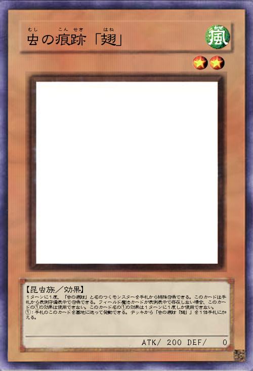 | 1ターンに1度、「虫の痕跡」と名のつくモンスターを手札から特殊召喚できる。このカードは手札から表側守備表示で召喚できる。フィールド魔法カードが表側表示で存在しない場合、このカードの①の効果は使用できない。このカード名の①の効果は1ターンに1度しか使用できない。 ①:手札のこのカードを墓地に送って発動できる。デッキから「虫の痕跡「翅」」を1体手札に加える。 | |||