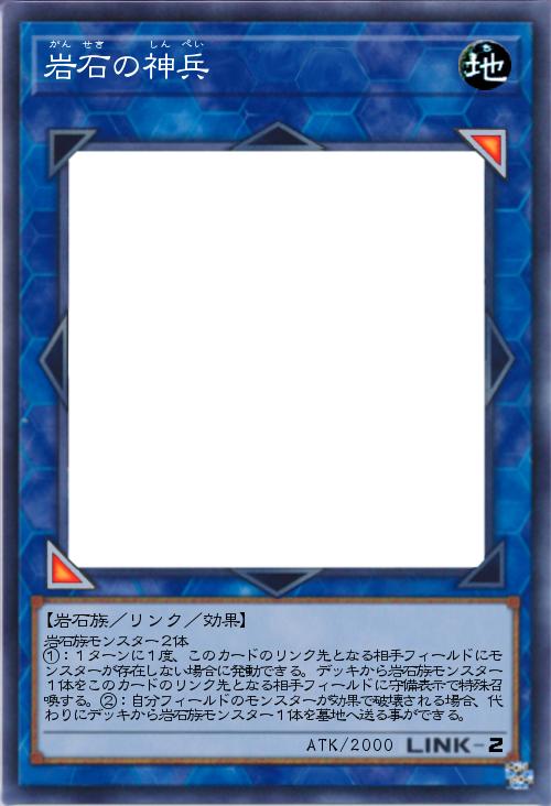 | 岩石族モンスター2体 ①:1ターンに1度、このカードのリンク先となる相手フィールドにモンスターが存在しない場合に発動できる。デッキから岩石族モンスター1体をこのカードのリンク先となる相手フィールドに守備表示で特殊召喚する。②:自分フィールドのモンスターが効果で破壊される場合、代わりにデッキから岩石族モンスター1体を墓地へ送る事ができる。 | |||