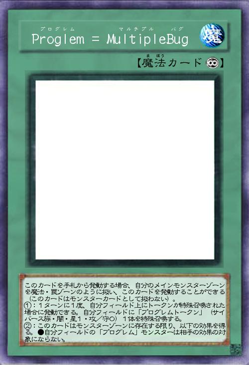 | このカードを手札から発動する場合、自分のメインモンスターゾーンを魔法・罠ゾーンのように扱い、このカードを発動することができる(このカードはモンスターカードとして扱わない)。 ①:1ターンに1度、自分フィールド上にトークンが特殊召喚された場合に発動できる。自分フィールドに「プログレムトークン」(サイバース族・闇・星1・攻/守0)1体を特殊召喚する。 ②:このカードはモンスターゾーンに存在する限り、以下の効果を得る。●自分フィールドの「プログレム」モンスターは相手の効果の対象にならない。 | |||