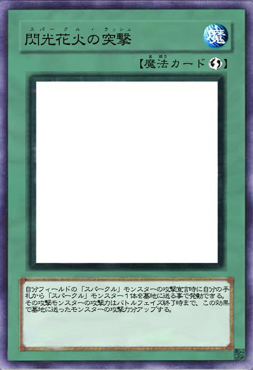 | 自分フィールドの「スパークル」モンスターの攻撃宣言時に自分の手札から「スパークル」モンスター1体を墓地に送る事で発動できる。その攻撃モンスターの攻撃力はバトルフェイズ終了時まで、この効果で墓地に送ったモンスターの攻撃力分アップする。 | |||