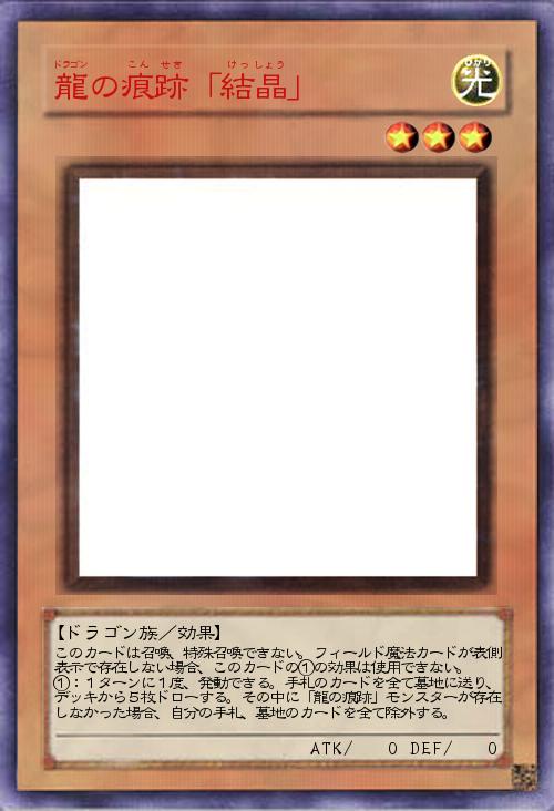 | このカードは召喚、特殊召喚できない。フィールド魔法カードが表側表示で存在しない場合、このカードの①の効果は使用できない。 ①:1ターンに1度、発動できる。手札のカードを全て墓地に送り、デッキから5枚ドローする。その中に「龍の痕跡」モンスターが存在しなかった場合、自分の手札、墓地のカードを全て除外する。 | |||