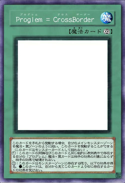 | このカードを手札から発動する場合、自分のメインモンスターゾーンを魔法・罠ゾーンのように扱い、このカードを発動することができる(このカードはモンスターカードとして扱わない)。 ①:このカードの両隣及びこのカードと同じ縦列に表側表示で存在する自分の「プログレム」魔法・罠カードは相手の効果の対象にならず、相手の効果で破壊されない。 ②:このカードはモンスターゾーンに存在する限り、以下の効果を得る。●このカードは、自分から見てこのカードより右に存在するカードの効果を受けない。 | |||