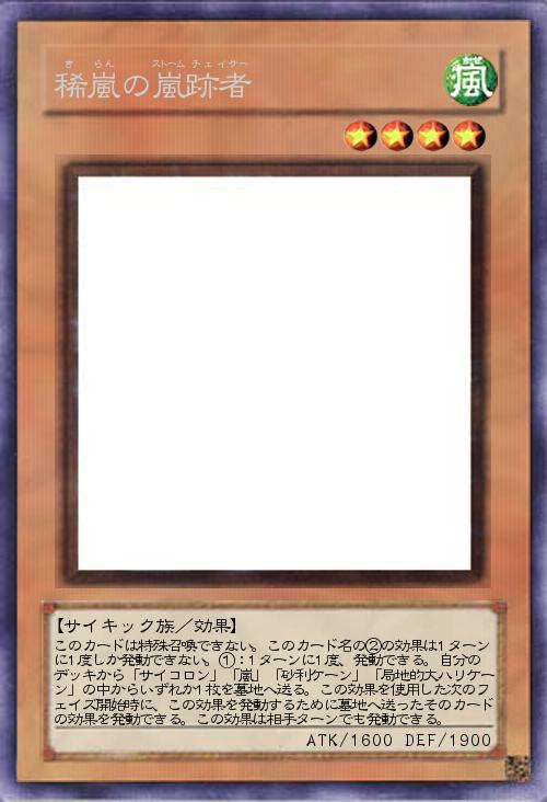 | このカードは特殊召喚できない。このカード名の②の効果は1ターンに1度しか発動できない。①:1ターンに1度、発動できる。自分のデッキから「サイコロン」「嵐」「砂利ケーン」「局地的大ハリケーン」の中からいずれか1枚を墓地へ送る。この効果を使用した次のフェイズ開始時に、この効果を発動するために墓地へ送ったそのカードの効果を発動できる。この効果は相手ターンでも発動できる。 | |||
