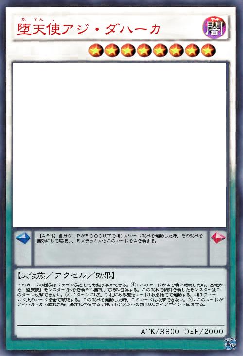 | このカードの種族はドラゴン族としても扱う事ができる。①:このカードがA召喚に成功した時、墓地から「堕天使」モンスター2体を召喚条件無視して特殊召喚する。この効果で特殊召喚したモンスターはこのターン攻撃できない。②:1ターンに1度、手札にある魔法カード1枚を捨てて発動する。相手フィールド上のカードを全て破壊する。この効果を発動した時、このカードは攻撃できない。③:このカードがフィールドから離れた時、墓地に存在する天使族モンスターの数×800ライフポイント回復する。 | |||