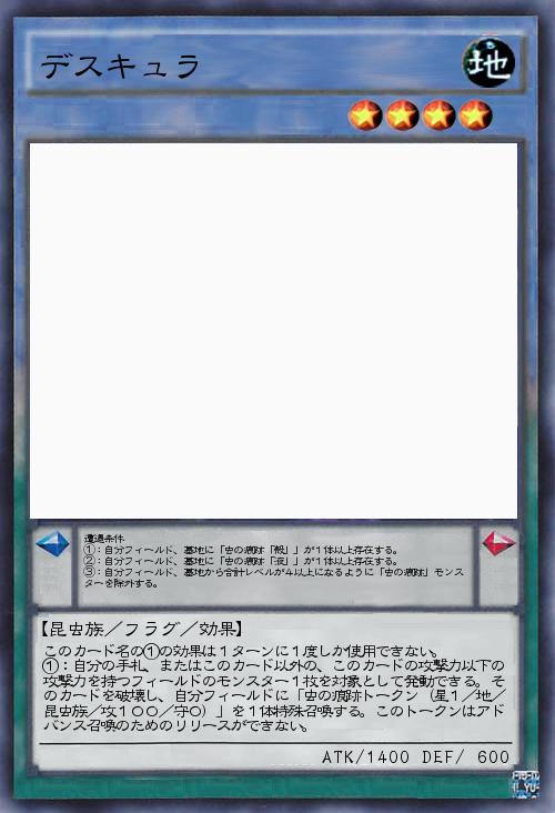 | このカード名の①の効果は1ターンに1度しか使用できない。 ①:自分の手札、またはこのカード以外の、このカードの攻撃力以下の攻撃力を持つフィールドのモンスター1枚を対象として発動できる。そのカードを破壊し、自分フィールドに「虫の痕跡トークン(星1/地/昆虫族/攻100/守0)」を1体特殊召喚する。このトークンはアドバンス召喚のためのリリースができない。 | |||