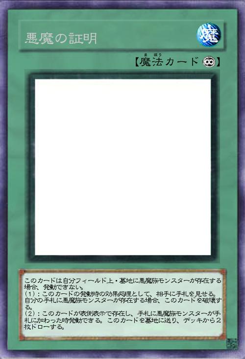 | このカードは自分フィールド上・墓地に悪魔族モンスターが存在する場合、発動できない。 (1):このカードの発動時の効果処理として、相手に手札を見せる。自分の手札に悪魔族モンスターが存在する場合、このカードを破壊する。 (2):このカードが表側表示で存在し、手札に悪魔族モンスターが手札に加わった時発動できる。このカードを墓地に送り、デッキから2枚ドローする。 | |||