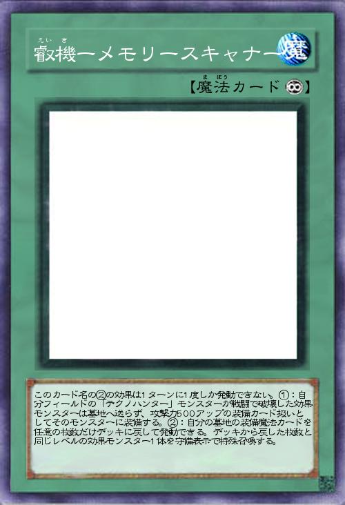 | このカード名の②の効果は1ターンに1度しか発動できない。①:自分フィールドの「テクノハンター」モンスターが戦闘で破壊した効果モンスターは墓地へ送らず、攻撃力500アップの装備カード扱いとしてそのモンスターに装備する。②:自分の墓地の装備魔法カードを任意の枚数だけデッキに戻して発動できる。デッキから戻した枚数と同じレベルの効果モンスター1体を守備表示で特殊召喚する。 | |||