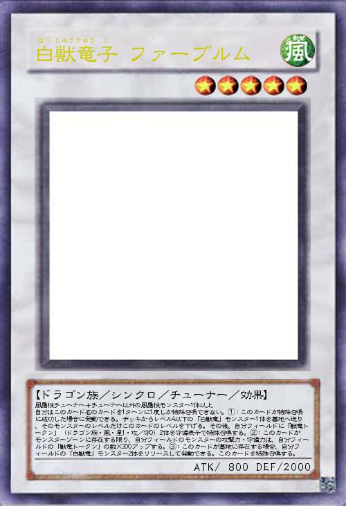 | 風属性チューナー+チューナー以外の風属性モンスター1体以上 自分はこのカード名のカードを1ターンに1度しか特殊召喚できない。①:このカードが特殊召喚に成功した場合に発動できる。デッキからレベル4以下の「白獣竜」モンスター1体を墓地へ送り、そのモンスターのレベルだけこのカードのレベルを下げる。その後、自分フィールドに「獣竜トークン」(ドラゴン族・風・星1・攻/守0)2体を守備表示で特殊召喚する。②:このカードがモンスターゾーンに存在する限り、自分フィールドのモンスターの攻撃力・守備力は、自分フィールドの「獣竜トークン」の数×300アップする。③:このカードが墓地に存在する場合、自分フィールドの「白獣竜」モンスター2体をリリースして発動できる。このカードを特殊召喚する。 | |||