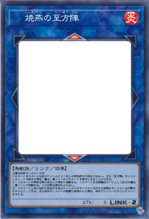 | 炎属性効果モンスター2体 このカード名のカードは自分フィールドに1枚しか表側表示で存在できない。また「至方陣」モンスターをリンク召喚する場合、魔法・罠ゾーンのこのカードを素材とすることができる。 ①:このカードが特殊召喚に成功した場合に発動する。このカードを永続魔法カードとして自分の魔法・罠ゾーンに移動する。この効果は無効化されない。 ②:このカードと同じ縦列に存在する自分フィールドのモンスター及びその両隣のモンスターは攻撃力が500アップする。また相手モンスターが戦闘で破壊された場合、相手プレイヤーに500ダメージを与える。 | |||
