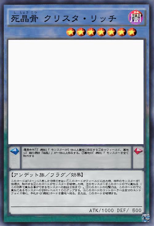 | このカードは1ターンに1度しか召喚できない①このカードがフィールドに出た時、相手のモンスターを1体選び、除外する②このカードがモンスターを破壊した時、そのモンスターをこのカードの下に重ねる(この効果で重ねる事ができるモンスターの数は2体まで)。③このカードの攻撃力は、このカードの下に重ねてあるモンスターの合計レベル×100アップする。④このカードのコントローラーは自分のエンドフェイズ毎に、手札から「痕跡」カードを墓地へ送る。または、このカードを破壊する。 | |||
