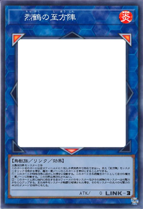 | 炎属性効果モンスター2体 このカード名のカードは自分フィールドに1枚しか表側表示で存在できない。また「至方陣」モンスターをリンク召喚する場合、魔法・罠ゾーンのこのカードを素材とすることができる。 ①:このカードが特殊召喚に成功した場合に発動する。このカードを永続魔法カードとして自分の魔法・罠ゾーンに移動する。この効果は無効化されない。 ②:このカードと同じ縦列に存在する自分フィールドのモンスター及びその両隣のモンスターは攻撃力が800アップする。また相手モンスターが戦闘で破壊された場合、そのモンスターの元々の攻撃力の半分のダメージを相手に与える。 | |||