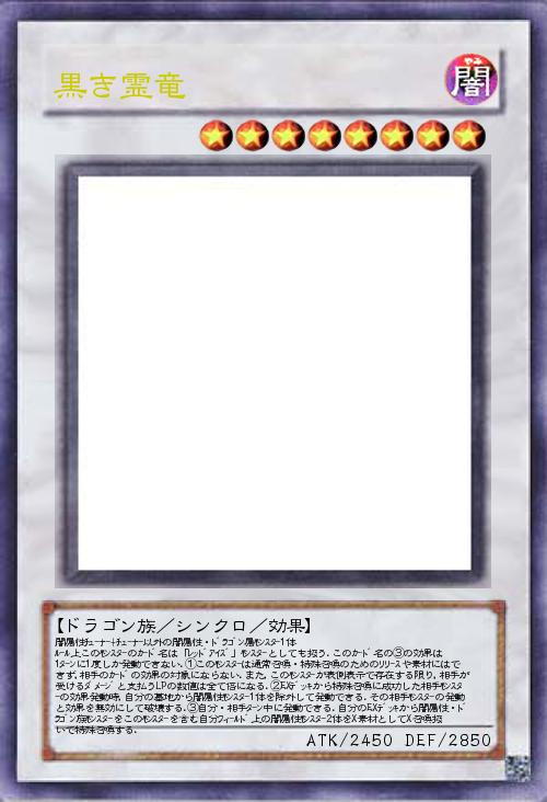 | 闇属性チュ-ナ-+チュ-ナ-以外の闇属性・ドラゴン属モンスタ-1体 ル-ル上このモンスタ-のカ-ド名は「レッドアイズ」モンスタ-としても扱う.このカ-ド名の③の効果は1タ-ンに1度しか発動できない.①このモンスタ-は通常召喚・特殊召喚のためのリリ-スや素材にはできず,相手のカ-ドの効果の対象にならない.また,このモンスタ-が表側表示で存在する限り,相手が受けるダメ-ジと支払うLPの数値は全て倍になる.②EXデッキから特殊召喚に成功した相手モンスタ-の効果発動時,自分の墓地から闇属性モンスタ-1体を除外して発動できる.その相手モンスタ-の発動と効果を無効にして破壊する.③自分・相手タ-ン中に発動できる.自分のEXデッキから闇属性・ドラゴン族モンスタ-をこのモンスタ-を含む自分フィ-ルド上の闇属性モンスタ-2体をX素材としてX召喚扱いで特殊召喚する. | |||