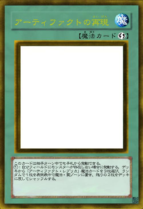 | このカードは相手ターン中でも手札から発動できる。 ①:自分フィールドにモンスターが存在しない場合に発動する。デッキから「アーティファクト・レプリカ」魔法カードを3枚選び、ランダムで1枚を表側表示で魔法・罠ゾーンに置き、残りの2枚をデッキに戻してシャッフルする。 | |||