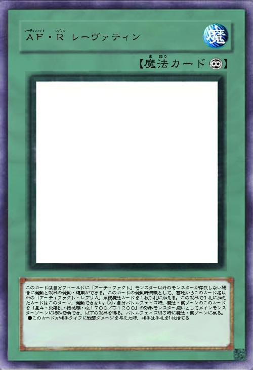| このカードは自分フィールドに「アーティファクト」モンスター以外のモンスターが存在しない場合に発動と効果の発動・適用ができる。このカードの発動時処理として、墓地からこのカード名以外の「アーティファクト・レプリカ」永続魔法カードを1枚手札に加える。この効果で手札に加えたカードはこのターン、発動できない。②:自分バトルフェイズ時、魔法・罠ゾーンのこのカードを「星4・炎属性・機械族・攻1700/守1200」の効果モンスター扱いとしてメインモンスターゾーンに特殊召喚でき、以下の効果を得る。バトルフェイズ終了時に魔法・罠ゾーンに戻る。 ●このカードが相手ライフに戦闘ダメージを与えた時、相手は手札を1枚捨てる | |||