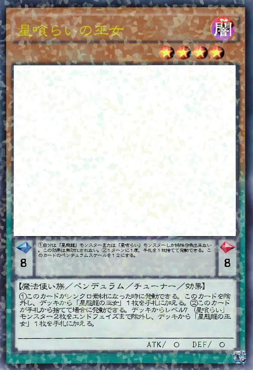 | ①このカードがシンクロ素材になった時に発動できる。このカードを除外し、デッキから「星態龍の巫女」1枚を手札に加える。②このカードが手札から捨てて場合に発動できる。デッキからレベル7(星喰らい」モンスター2枚をエンドフェイズまで除外し、デッキから「星態龍の巫女」1枚を手札に加える。 | |||