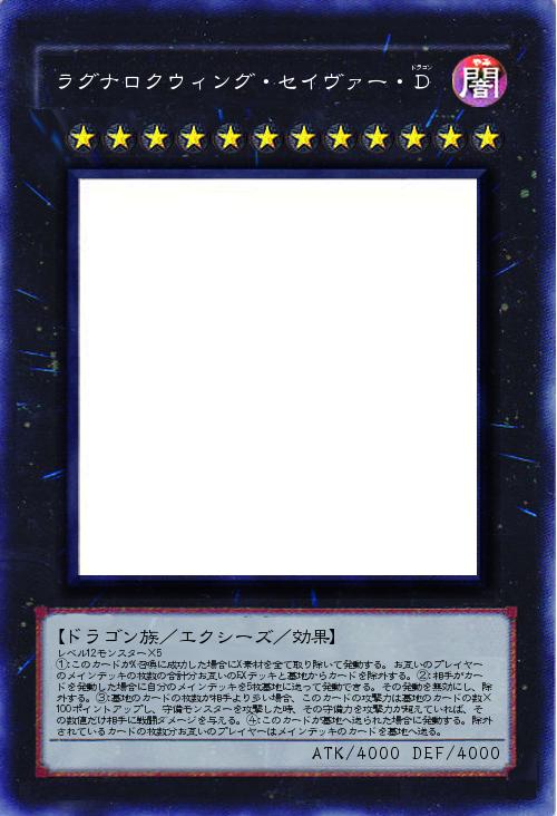 | レベル12モンスター×5 ①:このカードがX召喚に成功した場合にX素材を全て取り除いて発動する。お互いのプレイヤーのメインデッキの枚数の合計分お互いのEXデッキと墓地からカードを除外する。②:相手がカードを発動した場合に自分のメインデッキを5枚墓地に送って発動できる。その発動を無効にし、除外する。③:墓地のカードの枚数が相手より多い場合、このカードの攻撃力は墓地のカードの数×100ポイントアップし、守備モンスターを攻撃した時、その守備力を攻撃力が超えていれば、その数値だけ相手に戦闘ダメージを与える。④:このカードが墓地へ送られた場合に発動する。除外されているカードの枚数分お互いのプレイヤーはメインデッキのカードを墓地へ送る。 | |||