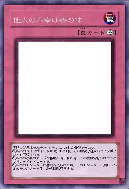 | 下記の効果はそれぞれ1ターンに1度しか発動できない。 ①相手のライフポイントが減少した時、その数値分自身のライフポイントを回復させる。 ②相手の手札のカードが墓地へ送られた時、その枚数分自分はデッキからカードをドローする。 ③相手のモンスターが墓地へ送られた時、そのモンスターと同じレベルのモンスターを手札から特殊召喚する。 | |||