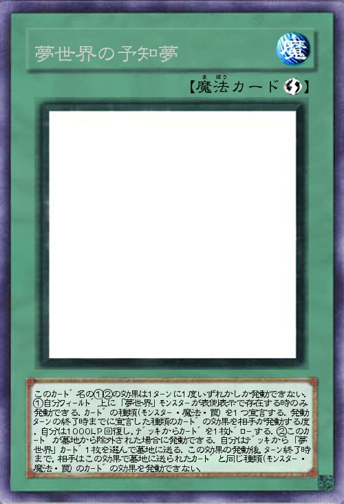 | このカ-ド名の①②の効果は1タ-ンに1度いずれかしか発動できない.①自分フィ-ルド上に「夢世界」モンスタ-が表側表示で存在する時のみ発動できる.カ-ドの種類(モンスタ-・魔法・罠)を1つ宣言する.発動タ-ンの終了時までに宣言した種類のカ-ドの効果を相手が発動する度,自分は1000LP回復し,デッキからカ-ドを1枚ドロ-する.②このカ-ドが墓地から除外された場合に発動できる.自分はデッキから「夢世界」カ-ド1枚を選んで墓地に送る.この効果の発動後,タ-ン終了時まで,相手はこの効果で墓地に送られたカ-ドと同じ種類(モンスタ-・魔法・罠)のカ-ドの効果を発動できない. | |||