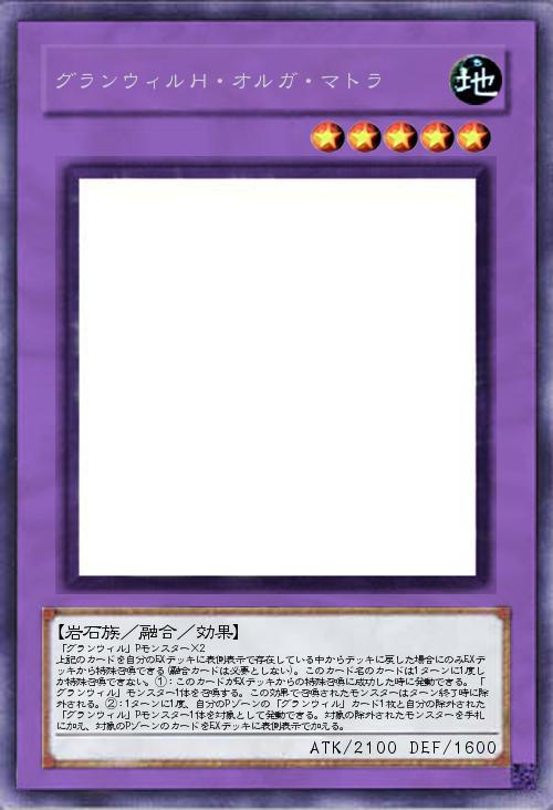 | 「グランウィル」Pモンスター×2 上記のカードを自分のEXデッキに表側表示で存在している中からデッキに戻した場合にのみEXデッキから特殊召喚できる(融合カードは必要としない)。このカード名のカードは1ターンに1度しか特殊召喚できない。①:このカードがEXデッキからの特殊召喚に成功した時に発動できる。「グランウィル」モンスター1体を召喚する。この効果で召喚されたモンスターはターン終了時に除外される。②:1ターンに1度、自分のPゾーンの「グランウィル」カード1枚と自分の除外された「グランウィル」Pモンスター1体を対象として発動できる。対象の除外されたモンスターを手札に加え、対象のPゾーンのカードをEXデッキに表側表示で加える。 | |||