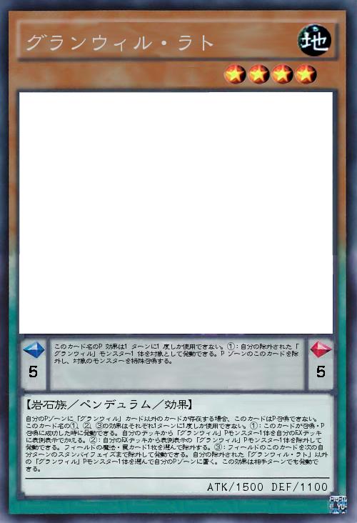 | 自分のPゾーンに「グランウィル」カード以外のカードが存在する場合、このカードはP召喚できない。このカード名の①、②、③の効果はそれぞれ1ターンに1度しか使用できない。①:このカードが召喚・P召喚に成功した時に発動できる。自分のデッキから「グランウィル」Pモンスター1体を自分のEXデッキに表側表示で加える。②:自分のEXデッキから表側表示の「グランウィル」Pモンスター1体を除外して発動できる。フィールドの魔法・罠カード1枚を選んで除外する。③:フィールドのこのカードを次の自分ターンのスタンバイフェイズまで除外して発動できる。自分の除外された「グランウィル・ラト」以外の「グランウィル」Pモンスター1体を選んで自分のPゾーンに置く。この効果は相手ターンでも発動できる。 | |||