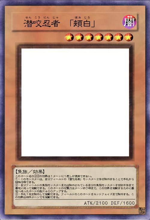 | このカード名の②③の効果は1ターンに1度しか使用できない。 ①:このモンスターは、自分フィールドの「潜咬忍者」モンスター2体を除外することで手札から特殊召喚できる。 ②:自分フィールドの魚族モンスターまたは除外されている自分の魚族モンスターを合計5体まで墓地に送って発動できる。このカードの攻撃力はターン終了時まで、この効果を発動するために墓地へ送ったカードの数×400アップする。 ③:手札1枚を除外して発動できる。フィールドのこのカードをエンドフェイズまで除外する。この効果は相手ターンでも発動できる。 | |||