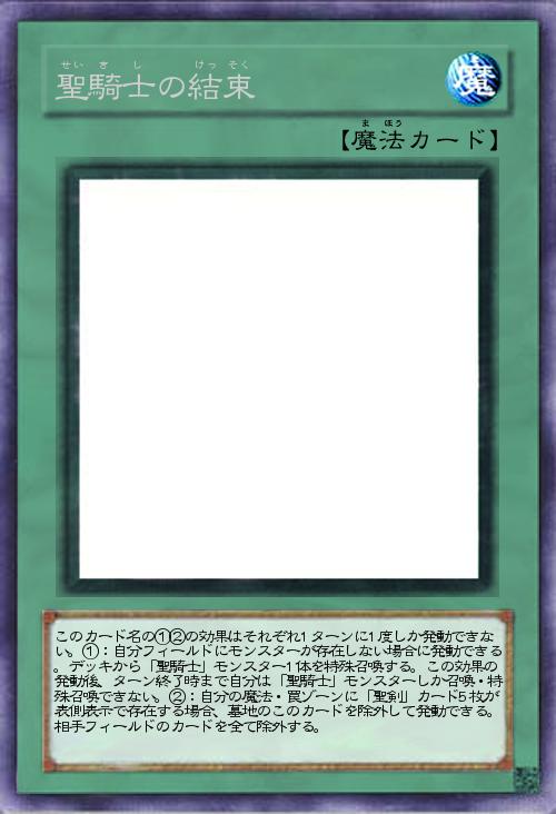 | このカード名の①②の効果はそれぞれ1ターンに1度しか発動できない。①:自分フィールドにモンスターが存在しない場合に発動できる。デッキから「聖騎士」モンスター1体を特殊召喚する。この効果の発動後、ターン終了時まで自分は「聖騎士」モンスターしか召喚・特殊召喚できない。②:自分の魔法・罠ゾーンに「聖剣」カード5枚が表側表示で存在する場合、墓地のこのカードを除外して発動できる。相手フィールドのカードを全て除外する。 | |||