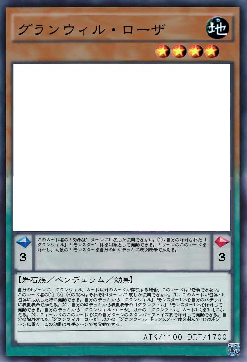 | 自分のPゾーンに「グランウィル」カード以外のカードが存在する場合、このカードはP召喚できない。このカード名の①、②、③の効果はそれぞれ1ターンに1度しか使用できない。①:このカードが召喚・P召喚に成功した時に発動できる。自分のデッキから「グランウィル」Pモンスター1体を自分のEXデッキに表側表示で加える。②:自分のEXデッキから表側表示の「グランウィル」Pモンスター1体を除外して発動できる。自分のデッキから「グランウィル・ローザ」以外の「グランウィル」カード1枚を手札に加える。③:フィールドのこのカードを次の自分ターンのスタンバイフェイズまで除外して発動できる。自分の除外された「グランウィル・ローザ」以外の「グランウィル」Pモンスター1体を選んで自分のPゾーンに置く。この効果は相手ターンでも発動できる。 | |||