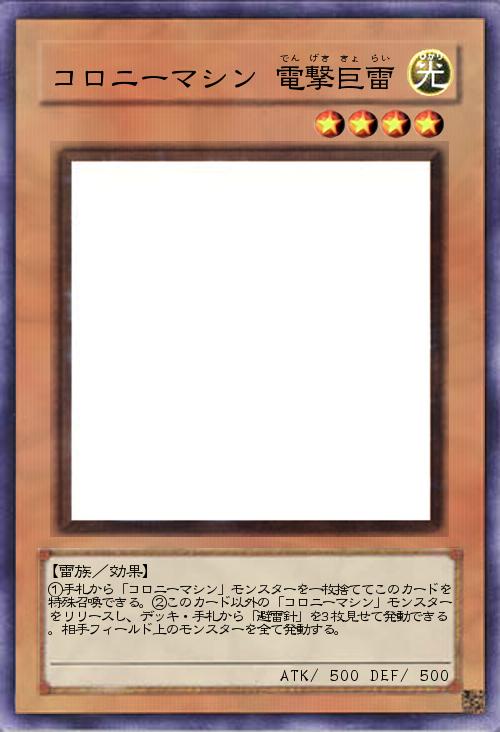 | ①手札から「コロニーマシン」モンスターを一枚捨ててこのカードを特殊召喚できる。②このカード以外の「コロニーマシン」モンスターをリリースし、デッキ・手札から「避雷針」を3枚見せて発動できる。相手フィールド上のモンスターを全て発動する。 | |||