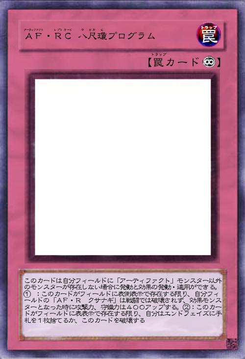 | このカードは自分フィールドに「アーティファクト」モンスター以外のモンスターが存在しない場合に発動と効果の発動・適用ができる。① :このカードがフィールドに表側表示で存在する限り、自分フィールドの「AF・R クサナギ」は戦闘では破壊されず、効果モンスターとなった時に攻撃力、守備力は400アップする。②:このカードがフィールドに表表示で存在する限り、自分はエンドフェイズに手札を1枚捨てるか、このカードを破壊する | |||