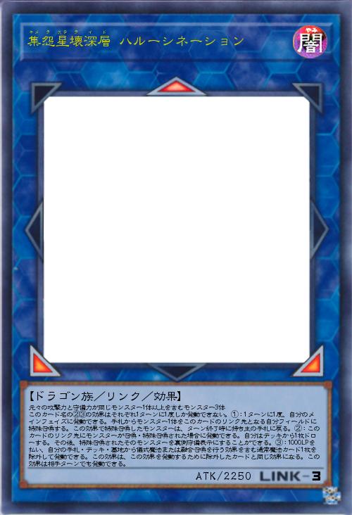 | 元々の攻撃力と守備力が同じモンスター1体以上を含むモンスター3体 このカード名の②③の効果はそれぞれ1ターンに1度しか発動できない。①:1ターンに1度、自分のメインフェイズに発動できる。手札からモンスター1体をこのカードのリンク先となる自分フィールドに特殊召喚する。この効果で特殊召喚したモンスターは、ターン終了時に持ち主の手札に戻る。②:このカードのリンク先にモンスターが召喚・特殊召喚された場合に発動できる。自分はデッキから1枚ドローする。その後、特殊召喚されたそのモンスターを裏側守備表示にすることができる。③:1000LPを払い、自分の手札・デッキ・墓地から儀式魔法または融合召喚を行う効果を含む通常魔法カード1枚を除外して発動できる。この効果は、この効果を発動するために除外したカードと同じ効果になる。この効果は相手ターンでも発動できる。 | |||