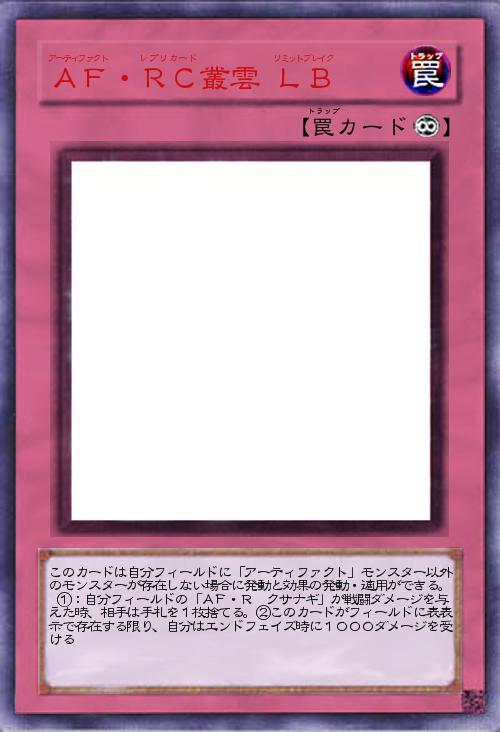 | このカードは自分フィールドに「アーティファクト」モンスター以外のモンスターが存在しない場合に発動と効果の発動・適用ができる。 ①:自分フィールドの「AF・R クサナギ」が戦闘ダメージを与えた時、相手は手札を1枚捨てる。②このカードがフィールドに表表示で存在する限り、自分はエンドフェイズ時に1000ダメージを受ける | |||