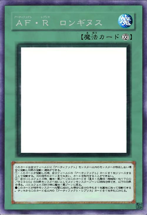 | このカードは自分フィールドに「アーティファクト」モンスター以外のモンスターが存在しない場合に発動と効果の発動・適用ができる。 ①:このカードが発動した時、自分フィールドの「アーティファクト」カードを1枚リリースすることで発動する。次の相手のターンまでお互い、カードを除外することができない。 ②:自分バトルフェイズ時、魔法・罠ゾーンのこのカードを「星5・光属性・機械族・攻1700/守2300」の効果モンスター扱いとしてメインモンスターゾーンに特殊召喚でき、以下の効果を得る。バトルフェイズ終了時に魔法・罠ゾーンに戻る。 ●このカードが相手モンスターへ攻撃に成功した場合に自分の手札を1枚墓地に送って発動できる。デッキからこのカード名以外の「アーティファクト・レプリカ」カードを1枚手札に加える。 | |||