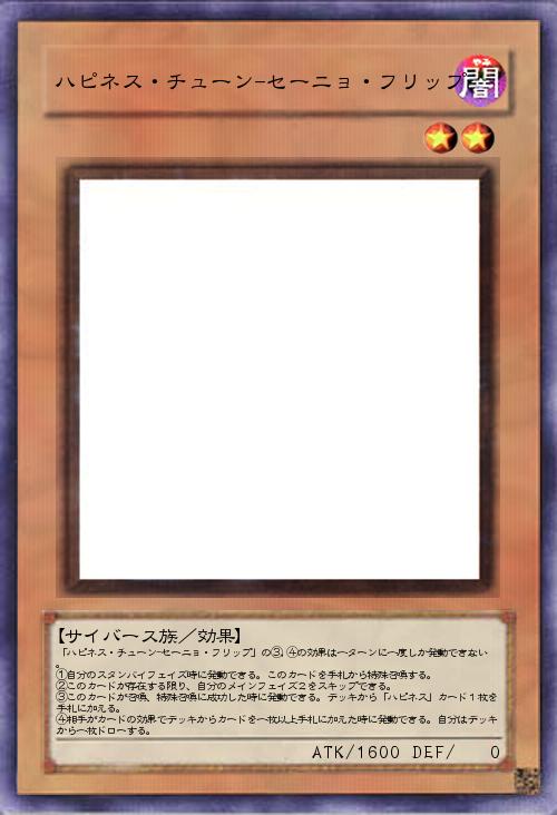 | 「ハピネス・チューン-セーニョ・フリップ」の③,④の効果は一ターンに一度しか発動できない。 ①自分のスタンバイフェイズ時に発動できる。このカードを手札から特殊召喚する。 ②このカードが存在する限り、自分のメインフェイズ2をスキップできる。 ③このカードが召喚、特殊召喚に成功した時に発動できる。デッキから「ハピネス」カード1枚を手札に加える。 ④相手がカードの効果でデッキからカードを一枚以上手札に加えた時に発動できる。自分はデッキから一枚ドローする。 | |||
