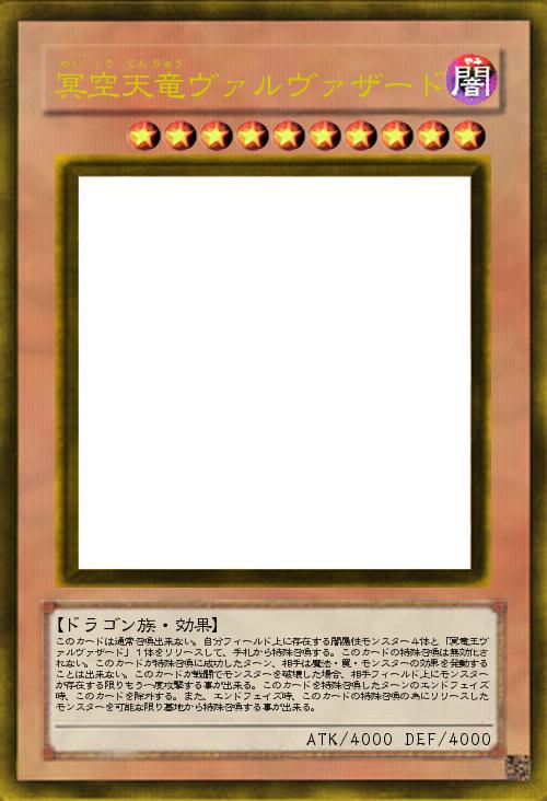 | このカードは通常召喚出来ない。自分フィールド上に存在する闇属性モンスター4体と「冥竜王ヴァルヴァザード」1体をリリースして、手札から特殊召喚する。このカードの特殊召喚は無効化されない。このカードが特殊召喚に成功したターン、相手は魔法・罠・モンスターの効果を発動することは出来ない。このカードが戦闘でモンスターを破壊した場合、相手フィールド上にモンスターが存在する限りもう一度攻撃する事が出来る。このカードを特殊召喚したターンのエンドフェイズ時、このカードを除外する。また、エンドフェイズ時、このカードの特殊召喚の為にリリースしたモンスターを可能な限り墓地から特殊召喚する事が出来る。 | |||