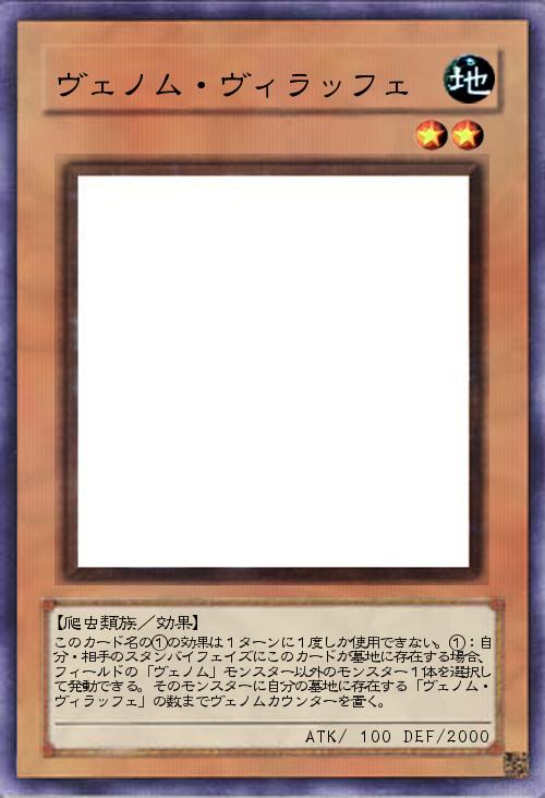 | このカード名の①の効果は1ターンに1度しか使用できない。①:自分・相手のスタンバイフェイズにこのカードが墓地に存在する場合、フィールドの「ヴェノム」モンスター以外のモンスター1体を選択して発動できる。そのモンスターに自分の墓地に存在する「ヴェノム・ヴィラッフェ」の数までヴェノムカウンターを置く。 | |||