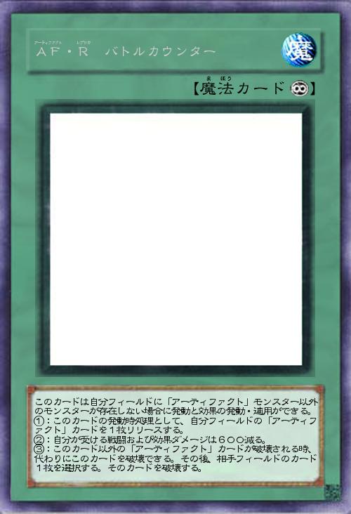 | このカードは自分フィールドに「アーティファクト」モンスター以外のモンスターが存在しない場合に発動と効果の発動・適用ができる。 ①:このカードの発動時処理として、自分フィールドの「アーティファクト」カードを1枚リリースする。 ②:自分が受ける戦闘および効果ダメージは600減る。 ③:このカード以外の「アーティファクト」カードが破壊される時、代わりにこのカードを破壊できる。その後、相手フィールドのカード1枚を選択する。そのカードを破壊する。 | |||