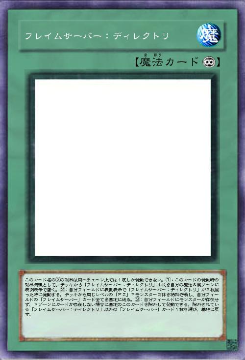 | このカード名の②の効果は同一チェーン上では1度しか発動できない。①:このカードの発動時の効果処理として、デッキから「フレイムサーバー:ディレクトリ」1枚を自分の魔法&罠ゾーンに表側表示で置く。②:自分フィールドに表側表示で「フレイムサーバー:ディレクトリ」が3枚揃った時に発動する。デッキから同じレベルの「FZ」Pモンスター2体を特殊召喚し、自分フィールドの「フレイムサーバー」カード全てを墓地に送る。③:自分フィールドにモンスターが存在せず、Pゾーンにカードが存在しない場合に墓地のこのカードを除外して発動できる。除外されている「フレイムサーバー:ディレクトリ」以外の「フレイムサーバー」カード1枚を選び、墓地に戻す。 | |||