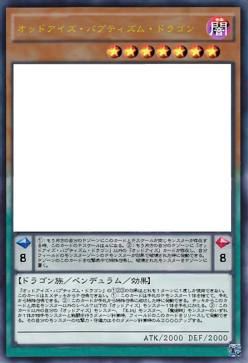 | ①:もう片方の自分のPゾーンにこのカードとPスケールが同じモンスターが存在する時、このカードのPスケールは4になる。②:もう片方の自分のPゾーンに「オッドアイズ・バプティズム・ドラゴン」以外の「オッドアイズ」カードが存在し、自分フィールドのモンスターゾーンのPモンスターが効果で破壊された時に発動できる。Pゾーンのこのカードを攻撃表示で特殊召喚し、破壊されたモンスターをPゾーンに置く。 | |||