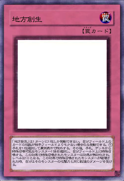 | 「地方創生」は1ターンに1枚しか発動できない。自分フィールド上のカードの枚数が相手フィールドよりも少ない場合のみ発動できる。①手札を1枚選択して裏側表示で除外する。その後、手札、デッキから特殊召喚可能なモンスター1体を選択し、自分フィールド上に特殊召喚する。この効果で特殊召喚されたモンスターは効果が無効化され、レベルは10となる。この効果で特殊召喚されたモンスターが破壊された時、自分はそのモンスターの攻撃力と同じ数値のダメージを受ける。 | |||
