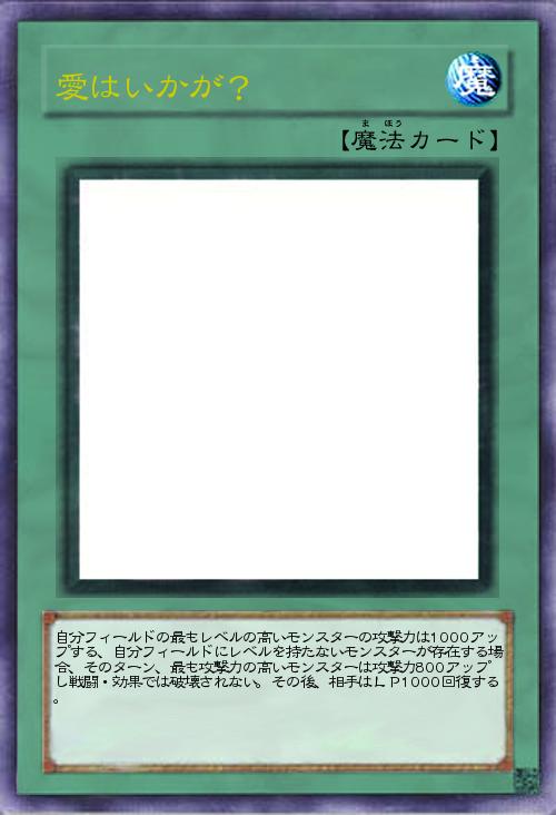 | 自分フィールドの最もレベルの高いモンスターの攻撃力は1000アップする、自分フィールドにレベルを持たないモンスターが存在する場合、そのターン、最も攻撃力の高いモンスターは攻撃力800アップし戦闘・効果では破壊されない。その後、相手はLP1000回復する。 | |||