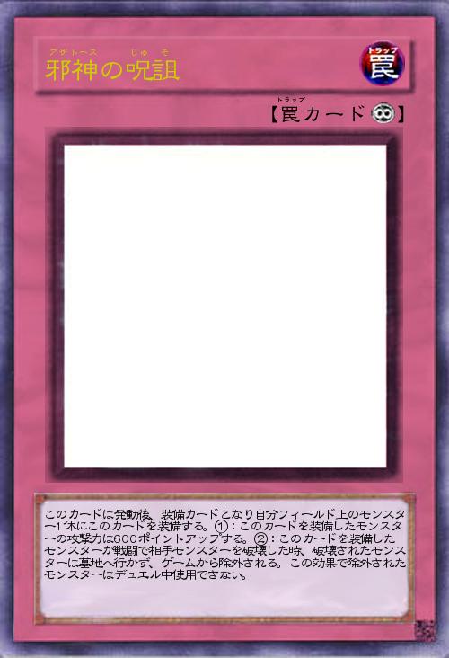 | このカードは発動後、装備カードとなり自分フィールド上のモンスター1体にこのカードを装備する。①:このカードを装備したモンスターの攻撃力は600ポイントアップする。②:このカードを装備したモンスターが戦闘で相手モンスターを破壊した時、破壊されたモンスターは墓地へ行かず、ゲームから除外される。この効果で除外されたモンスターはデュエル中使用できない。 | |||