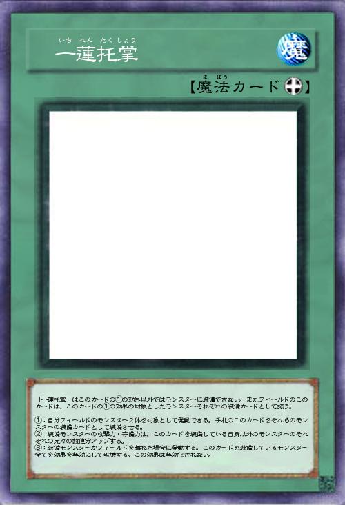 | 「一蓮托掌」はこのカードの①の効果以外ではモンスターに装備できない。またフィールドのこのカードは、このカードの①の効果の対象としたモンスターそれぞれの装備カードとして扱う。 ①:自分フィールドのモンスター2体を対象として発動できる。手札のこのカードをそれらのモンスターの装備カードとして装備させる。 ②:装備モンスターの攻撃力・守備力は、このカードを装備している自身以外のモンスターのそれぞれの元々の数値分アップする。 ③:装備モンスターがフィールドを離れた場合に発動する。このカードを装備しているモンスター全てを効果を無効にして破壊する。この効果は無効化されない。 | |||