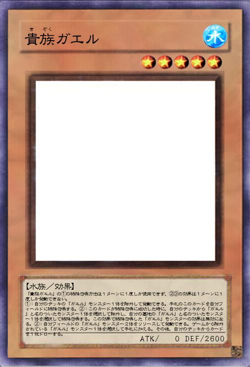 | 「貴族ガエル」の①の特殊召喚方法は1ターンに1度しか使用できず、②③の効果は1ターンに1度しか発動できない。 ①:自分のデッキの「ガエル」モンスター1体を除外して発動できる。手札のこのカードを自分フィールドに特殊召喚する。②:このカードが特殊召喚に成功した時に、自分のデッキから「ガエル」と名のついたモンスター1体を選択して除外し、自分の墓地の「ガエル」と名のついたモンスター1体を選択して特殊召喚する。この効果で特殊召喚した「ガエル」モンスターの効果は無効になる。②:自分フィールドの「ガエル」モンスター2体をリリースして発動できる。ゲームから除外されている「ガエル」モンスター1体を選択して手札に加える。その後、自分のデッキからカードを1枚ドローする。 | |||