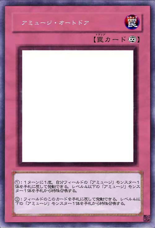 | ①:1ターンに1度、自分フィールドの「アミュージ」モンスター1体を手札に戻して発動できる。レベル4以下の「アミュージ」モンスター1体を手札から特殊召喚する。 ②:フィールドのこのカードを手札に戻して発動できる。レベル4以下の「アミュージ」モンスター1体を手札から特殊召喚する。 | |||