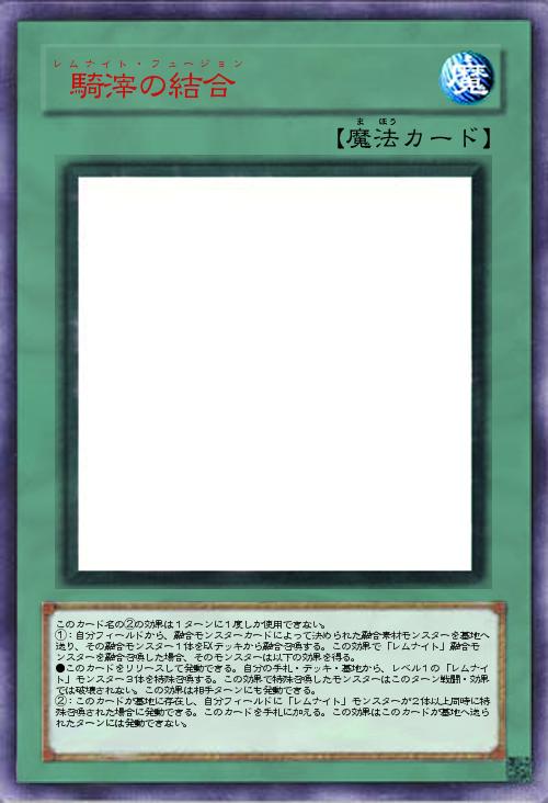 | このカード名の②の効果は1ターンに1度しか使用できない。 ①:自分フィールドから、融合モンスターカードによって決められた融合素材モンスターを墓地へ送り、その融合モンスター1体をEXデッキから融合召喚する。この効果で「レムナイト」融合モンスターを融合召喚した場合、そのモンスターは以下の効果を得る。 ●このカードをリリースして発動できる。自分の手札・デッキ・墓地から、レベル1の「レムナイト」モンスター3体を特殊召喚する。この効果で特殊召喚したモンスターはこのターン戦闘・効果では破壊されない。この効果は相手ターンにも発動できる。 ②:このカードが墓地に存在し、自分フィールドに「レムナイト」モンスターが2体以上同時に特殊召喚された場合に発動できる。このカードを手札に加える。この効果はこのカードが墓地へ送られたターンには発動できない。 | |||